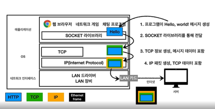 미국에 있는 친구에게 Message를 보내고 싶다. 그러면 먼저, Socket library를 통해, OS 계층에다 Message를 넘긴다.OS 계층에서 TCP가 MEssage에다가 TCP정보를 감싼다.