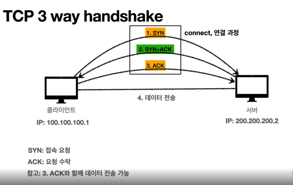 서버에서 오면, 클라이언트에게 2.SYN+ACK를 보내준다. 그런 다음 클라이언트가 ACK를 서버에게 보낸다. 이렇게 해서, 3 Way Handshake가 된다. 그러한 과정을 다 거치고 나서, 연결이 되고 나면 데이터를 전송하게 된다.