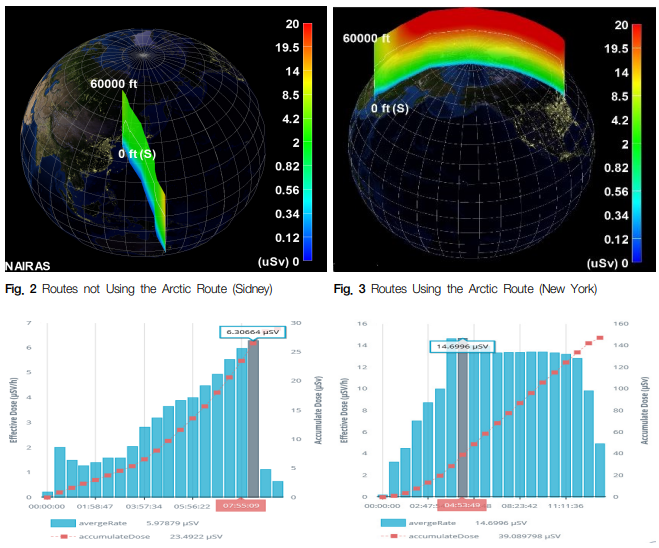 북극 항로를 이용하지 않을 경우에 시간당 최대선량이 약 5 μSv/h 전후, 북극항로를 이용할 경우에 시간당 최