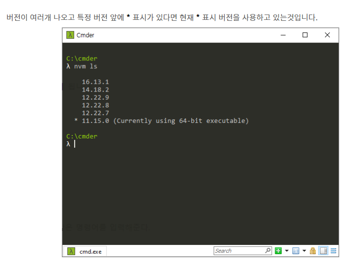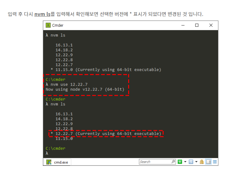 그럼 목록이 나오고 설치한 node 버전 목록 중 사용하고 싶은 버전의 node로 변경하려면