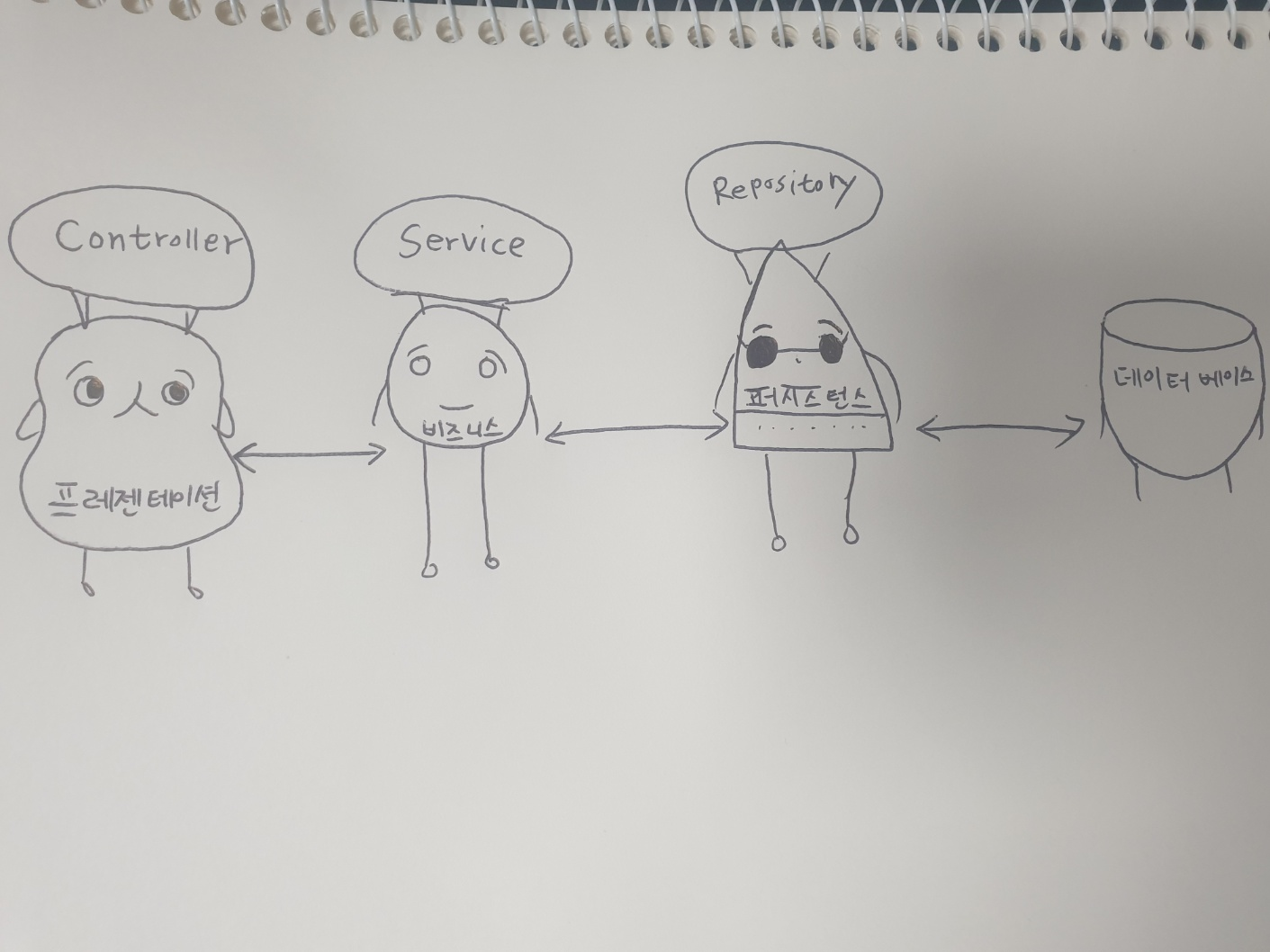 Spring Boot는 다음 그림에서 보듯 각 계층이 양 옆의 계층과 통신하는 구조를 따른다. 여기서 계층이라는 단어는