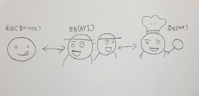 여기서 손님은 클라이언트, 주방에서 일하는 요리사를 서버라고 생각하면 된다. 그리고 중간에 있는 점원을 API라고 생각하면 된다. 이상황을 웹 사이트에 방문하는 상황에 적용해서 생각해보자. 사용자가 주소를 입력해서 '구길 메인 화면을 보여줘'라고 요청을 할 것이다. 그러면 API는 이 요청을 받아 서버에게 가져다준다. 그러면 서버는 API가 준 요청을 처리해 결과물을 만들고 이것을 다시 API로 전달한다. 그러면 API는 최종 결과물을 브라우저에 보내 화면을 볼 수 있게 된다.