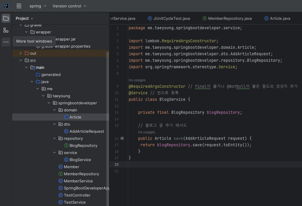 @RequiredArgsConstructor는 빈을 생성자로 생성하는 롬복에서 지원하는 Annotation이다. final 키워드나 @NotNull이 붙은 필드로 생성자를 만들어준다. @Service 애너테이션은 해당 클래스를 빈으로 서블릿 컨테이너에 등록해준다. save()메서드는 JpaRepository에서 지원하는 저장 메서드 save()로 AddArticleRequest 클래스에 저장된 값들을 article 데이터베이스에 저장한다.