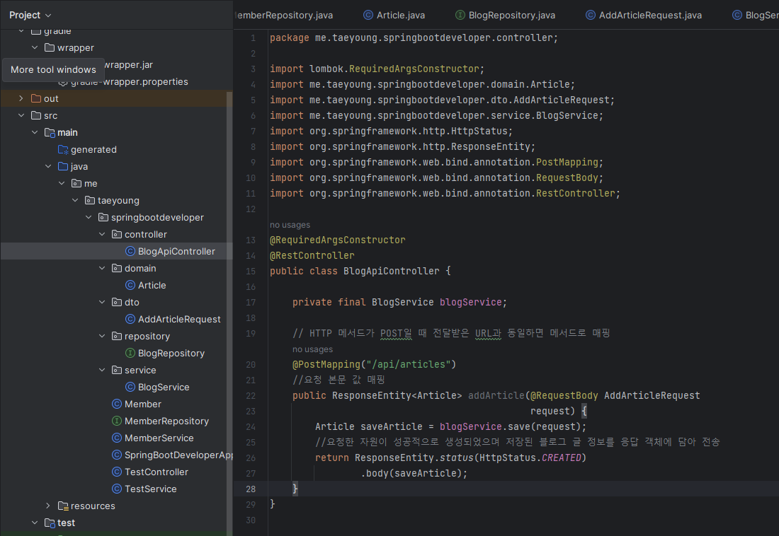 이제 URL에 매핑하기 위한 컨트롤러 메서드를 추가한다. 앞서 컨트롤러 메서드를 구현한 적이 있는데. 다시 복습하자면 컨트롤러 메서드에는 URL 매핑 애너테이션 @GetMapping, @PostMapping, @PutMapping, @DeleteMapping 등을 사용할 수 있다. 이름에서 볼 수 있듯이 각 메서드는 HTTP 메서드에 대응한다. 여기에서는 /api/articles에 POST요청이 오면 @PostMapping을 이용해 요청을 매핑한 뒤, 블로그 글을 생성하는 BlogService의 save() 메서드를 호출한 뒤, 생성된 블로그 글을 반환하는 작업을 할 addArticle() 메서드를 작성한다.