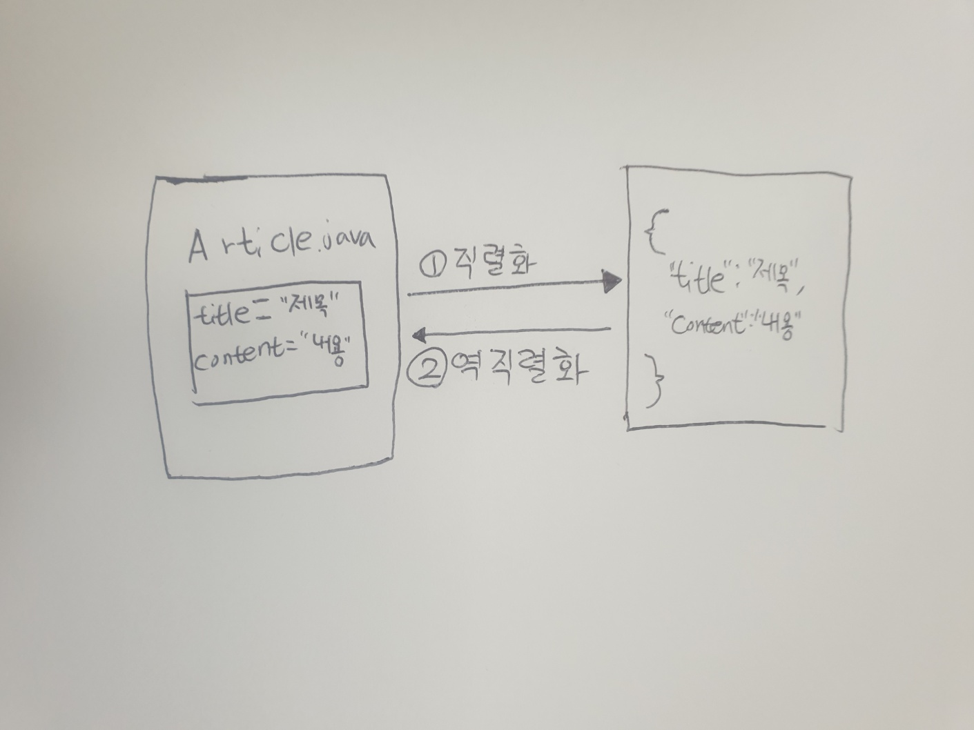 HTTP에서는 JSON을, 자바에서는 객체를 사용한다. 하지만 서로 형식이 다르기 때문에 형식에 맞게 변환하는 작업이 필요하다. 이런 작업들을 직렬화,역직렬화라고 한다. ① 직렬화란 자바 시스템 내부에서 사용되는 객체를 외부에서 사용하도록 데이터를 변환하는 작업을 이야기한다. 예를 들어 title은 "제목", content는 "내용"이라는 값이 들어 있는 객체가 있다고 가정을 들겠다. 이때 이 객체를 JSON 형식으로 직렬화할 수 있다. ② 역직렬화는 직렬화의 반대이다. 외부에서 사용하는 데이터를 자바 객체 형태로 변환하는 작업을 이야기한다. JSON 형식의 값을 자바 객체에 맞게 변환하는 것도 역직렬화 이다.