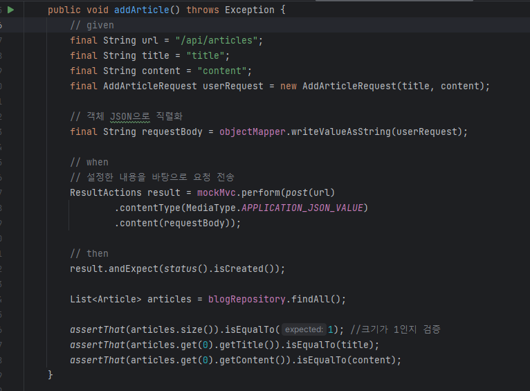 이제 블로그 글 생성 API를 테스트하는 코드를 작성하면 된다. given-when-then 패턴을 생성할 코드의 내용은 다음과 같다.
