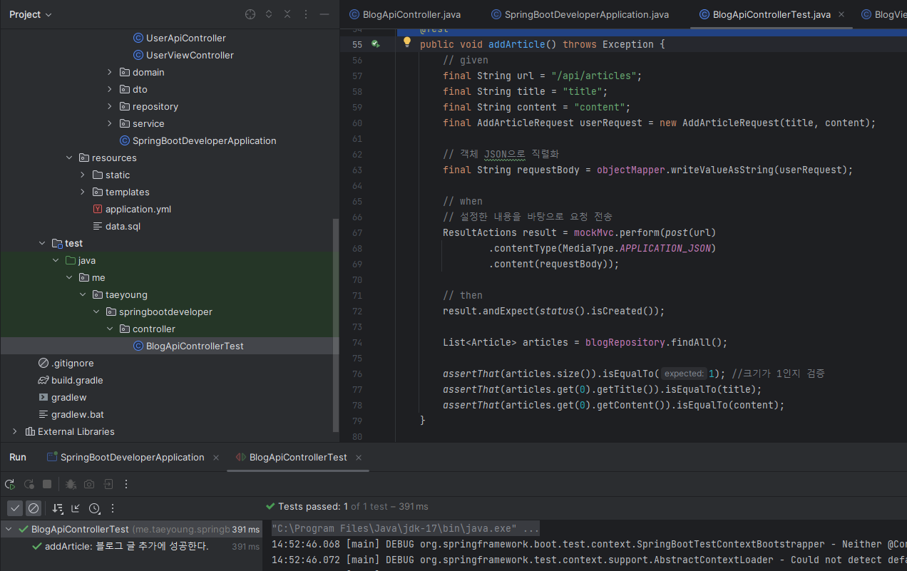 BlogApiControllerTest.java 파일에 작성하면 된다.