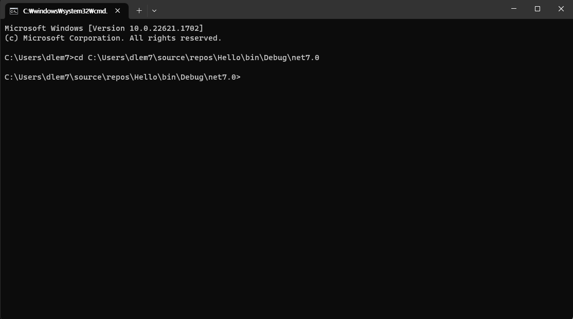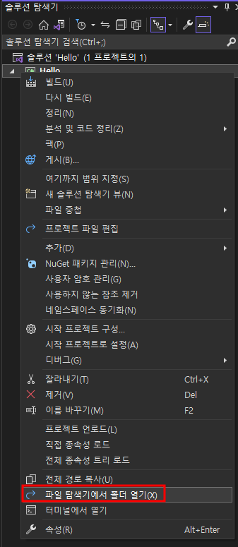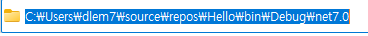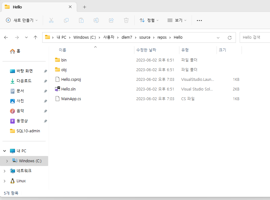 이후 아래와 같은 폴더가 열리는데, bin->Debug->net7.0으로 이동 시, 빌드한 Hello가 생성되어있다.