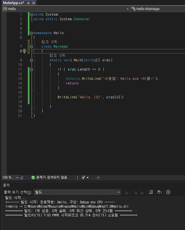 아래와 같이 코드를 만들고, Solution Bulid를 하면, 빌드가 성공 되는 걸 볼 수 있다.