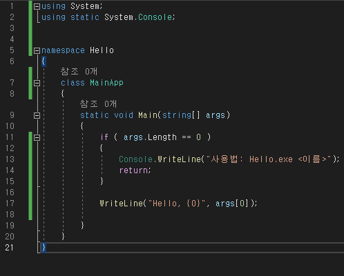 Console.WriteLine ...; 코드는 System.Console.WriteLine.;..;으로 글자 수가 늘어났을 것이다. 앞에서 System 네임스페이스를 사용하겠다고 선언한 덕에 코드의 양을 줄일 수 있게 되었다.