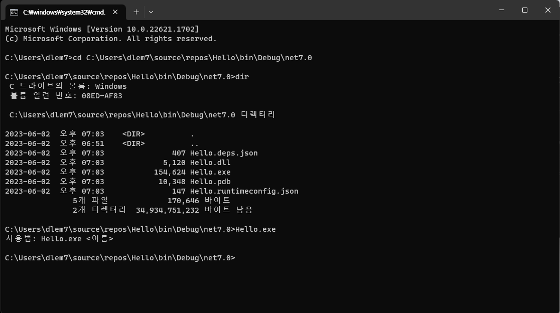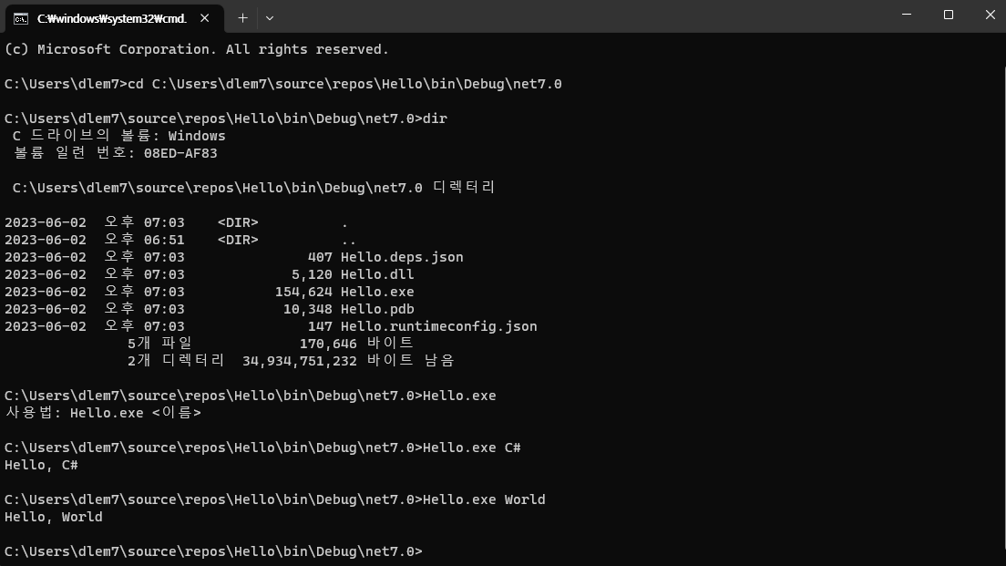 아래와 같이 Hello.exe 뒤에 인자를 넣으면 다르게 출력 된다.