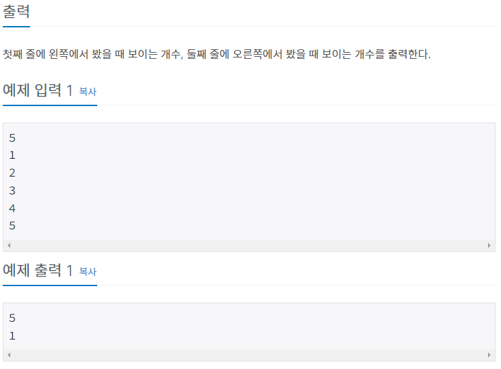 트로피의 높이를 왼쪽에서 보았을 때, 오른쪽에서 보았을 때 높이가 다르기 때문에 높이가 작은 트로피 큰 트로피에 가려져서 안보인다고 한다. 그래서, 왼쪽에서 보았을 때와 오른쪽에서 보았을 때 각각 보이는 개수를 출력하는 문제이다.