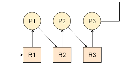 그러나 여러 프로세스가 동시에 실행되는 시스템에서는 복잡한 상황이 발생할 수 있다. 이를 이해하기 위해 간단한 예시로, 세 가지 프로세스 P1, P2, P3와 세 가지 리소스 R1, R2, R3이 있다고 가정해보자. 이 시점에서 각각의 프로세스는 이미 하나의 리소스를 할당 받았다고 가정하자: P1은 R1, P2는 R2, P3는 R3을 갖고 있다고 가정.