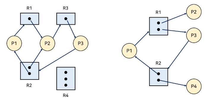 위의 그림에서는 왼쪽 그래프는 Deadlock이지만, 오른쪽 그래프는 Deadlock이 아니다.
