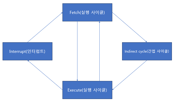 - 간접 사이클 (Indirect cycle): 명령어를 실행하기 위해 한 번 더 메모리 접근을 하는 과정을 간접 사이클이라고 한다. 간접 주소 지정 방식을 사용하는 경우에 필요한 사이클이다.