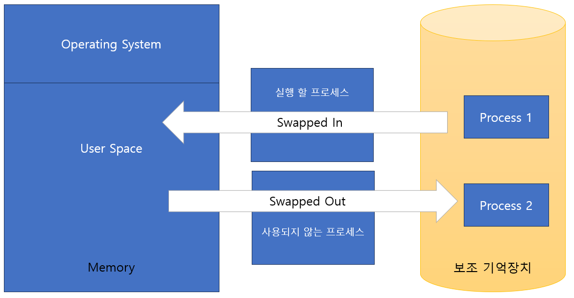 스왑핑은 크게 스왑인과 스왑아웃 두 가지 과정으로 나뉜다. 스왑아웃은 주 메모리에서 프로세스를 하드 디스크로 옮기는 것을 말하며, 반대로 스왑인은 하드 디스크에서 프로세스를 다시 주 메모리로 가져오는 것을 말한다.