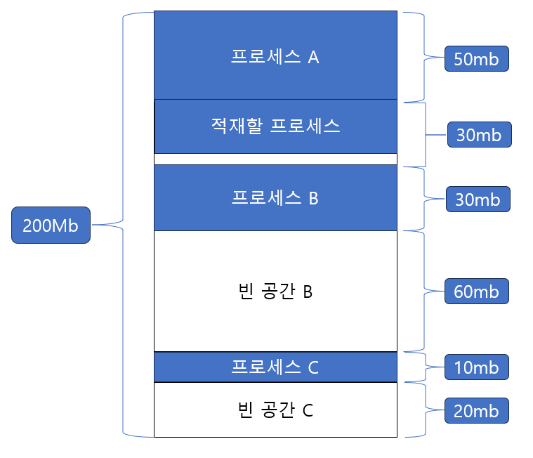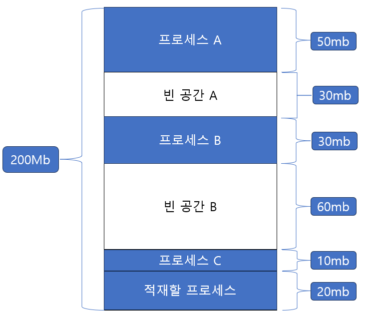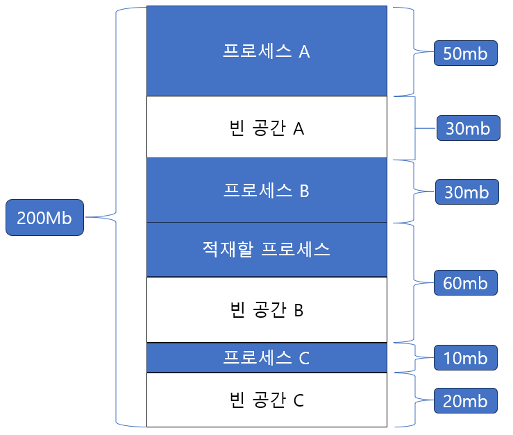 대표적으로 최초 적합, 최적 접합, 최악 적합의 세 가지 방식이 있다. 이는 그림과 함께 이해하는 것이 좋다. 가령 아래와 같은 상황에서 20MB 크기의 프로세스를 적재하고 싶다고 해보자. 메모리의 사용자 영역은 총 200MB라고 가정해 보자. 프로세스를 적재할 수 있는 빈 공간은 빈 공간 A, 빈 공간 B, 빈 공간 C 세군데가 있다.