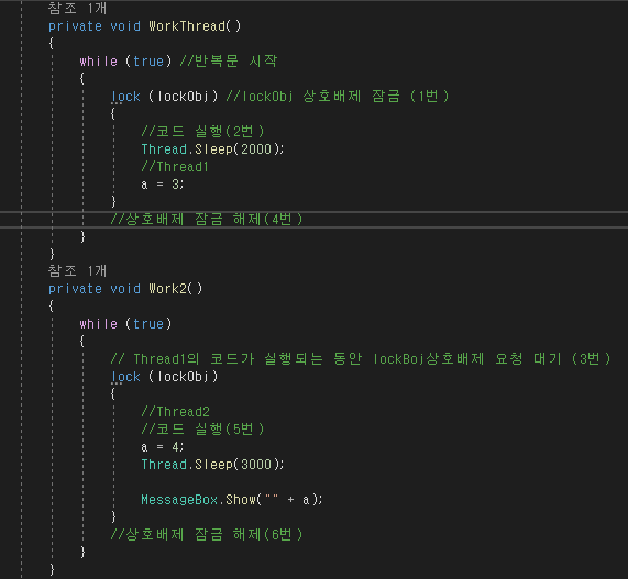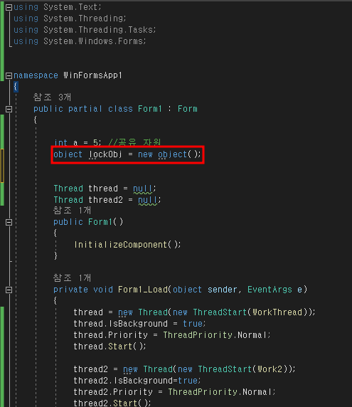 먼저 동기화에 사용할 객체를 정의해줘야 한다.ex) object lockObj = new object();