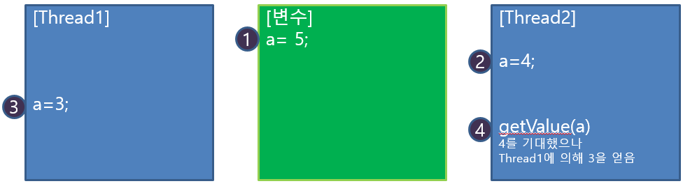 처음 a값에 변수 5를 가지고 있는데 Thread2에서 a 값을 4로 변경하고 getValue(a)를 통해서 4값을 동기화를 해주면, 4값을 얻을 수 있는데, 만약 동기화가 안되어 있다면 getValue(a)에서 4를 기대했으나, Thread1에 의해서 3으로 변경한 것이 영향을 받게 되어, 3의 값을 얻게 되버린다.