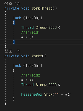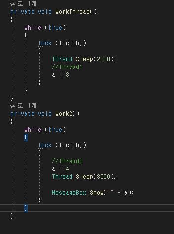 MessageBox.Show(""+a);를 통해 a메세지가 출력되는 것이다. 즉, Set()을 보내기 전까지 Thread2의 Set()의 윗코드가 실행된다.