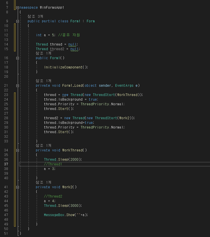 아래와 같이 코드를 작성하게 되면, Thread2에서는 Thread1의 영향을 받아, Message Box에서는 3이 출력되는 상황이 벌어진다.