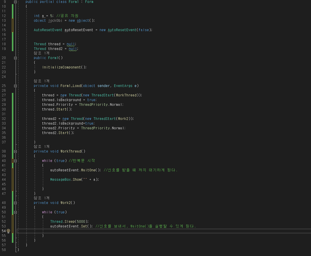 이 AutoResetEvent를 true로 바꾸게 되면, 첫번째 신호는 받은 상태로 변경된다. 즉 실행하자마자 변수가 나타나고, 이후 Sleep()등을 통해, 작동 된다.