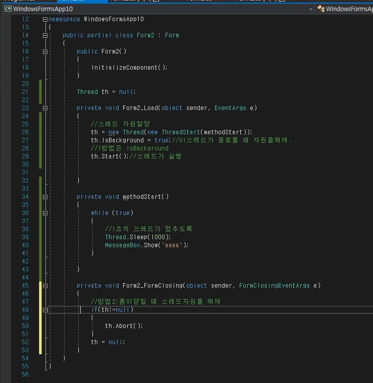 Form이 종료되는 시점에 작동하는 이벤트인 Form Closing을 이용해 스레드의 자원을 해제할 수도 있다. 만약 Form이 닫히는 시점에 생성된 스레드가 아직 실행 중이라면 해당 스레드를 종료하고 자원을 해제하는 코드를 작성한다. 이를 통해 스레드가 더 이상 필요하지 않은 시점에 정확하게 스레드를 종료하고 자원을 회수할 수 있다.