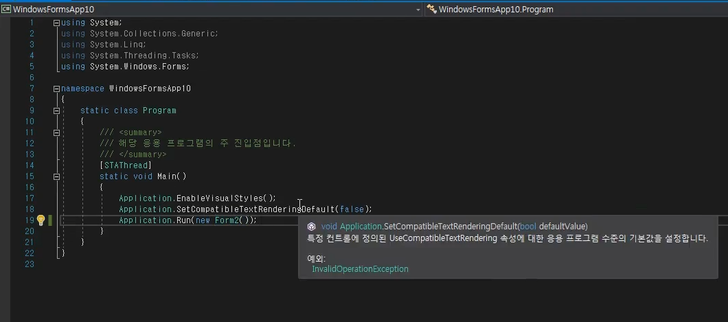 이유는 UIThread 즉, Program.cs에서 Form2로 변경해야지만, 삭제가 된다.