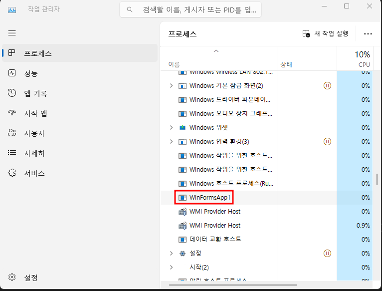 창을 닫으면, WinFormsApp1이 실행 종료가 된 줄 알았는데 작업관리자에 가보니, Background에서 여전히 실행 중인 것을 알 수 있다.