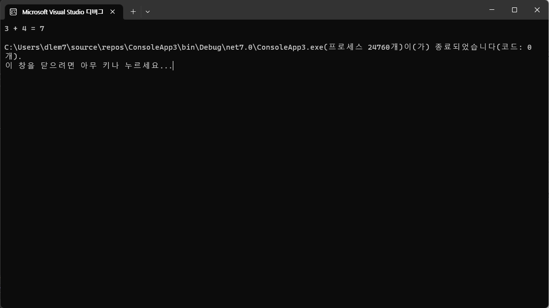 Console.WriteLine($"3 + 4 = {result}");
