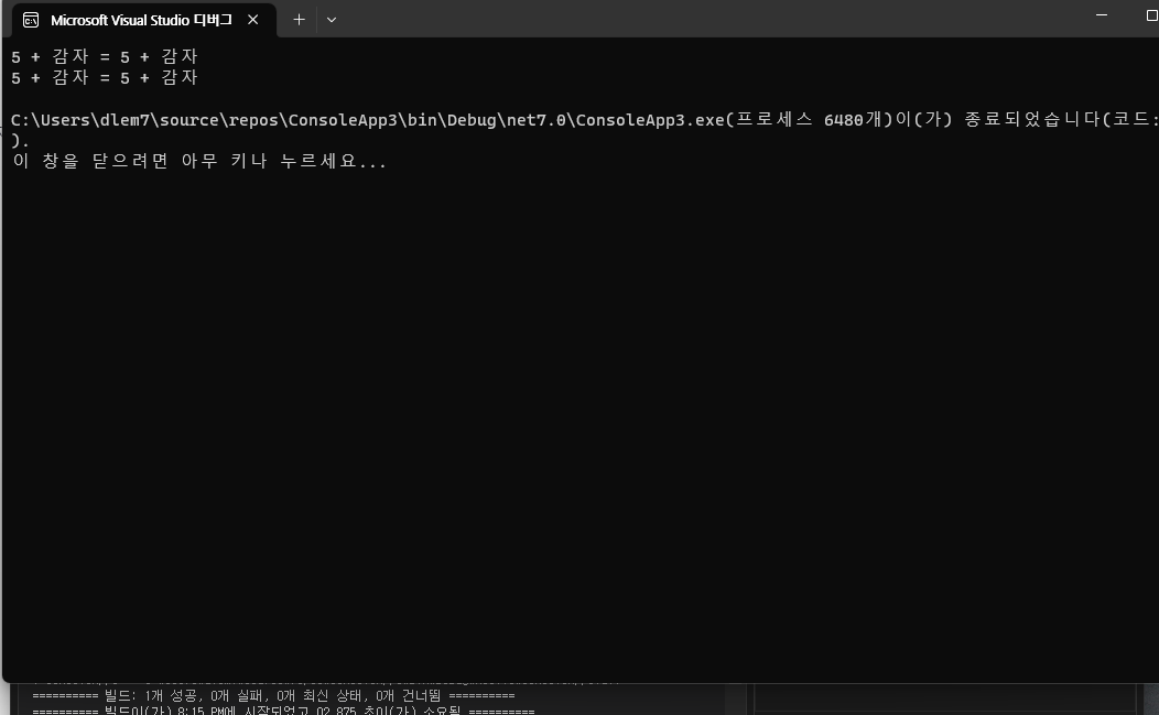 Console.WriteLine($"5 + 감자 = {resultFunc}");