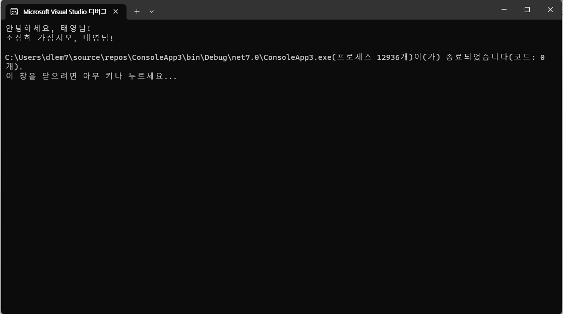 Console.WriteLine($"조심히 가십시오, {name}!");