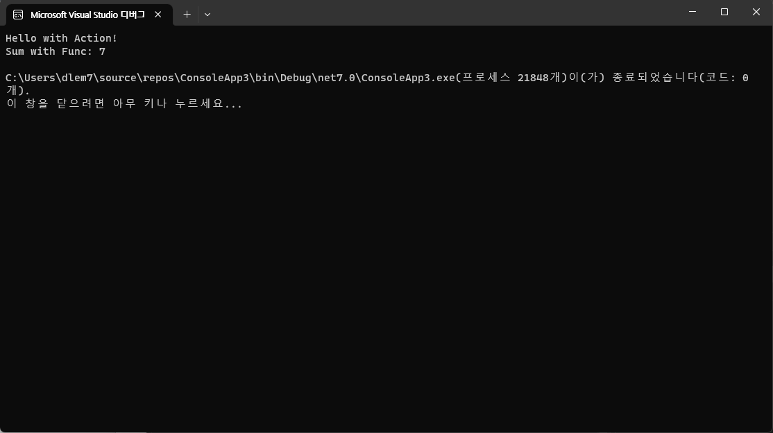 ConsoleApp 프로젝트를 만들어서 대리자 선언 및 사용하는 코드