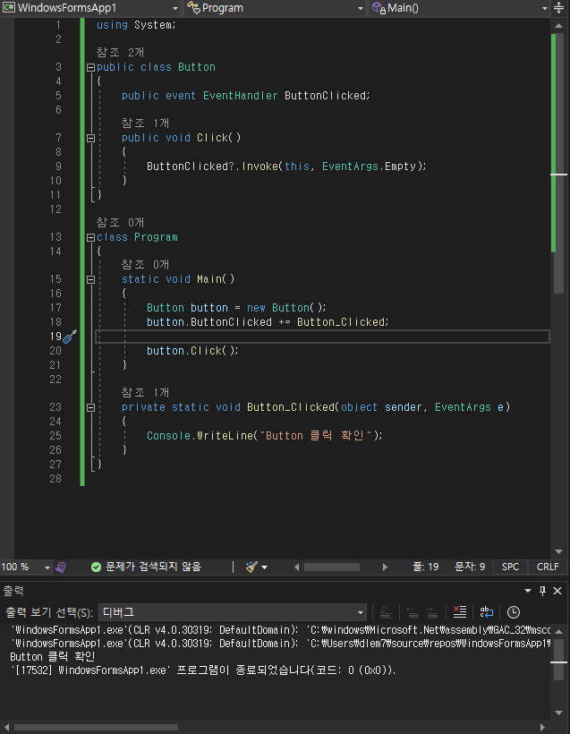 Program.cs에 아래와 같이 코드를 작성하고 실행해보면, Button 클릭 확인 문구가 출력되는걸 볼 수 있다.