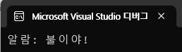 Console.WriteLine($"알람: {message}");