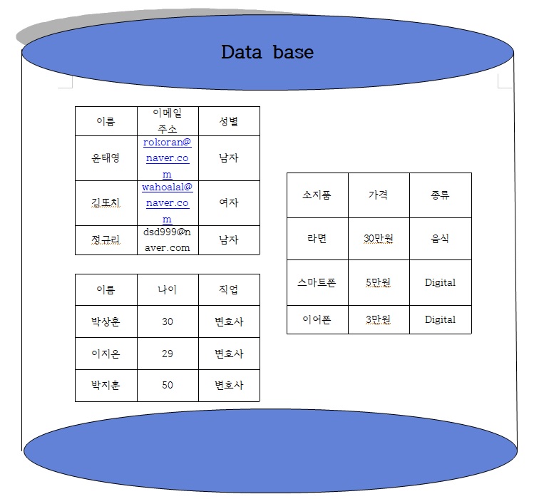 위의 형태처럼, 1개의 Data base에는 여러 개의 테이블이 존재할 수 있는데,