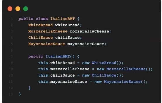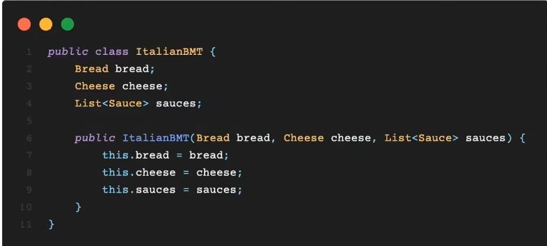 앞서 본 얘기를 코드로 살펴보면 빵,치즈,소스를 모두 ItalianBMT Code 내에서 생성해 초기화 하는 것을 알 수 있다.