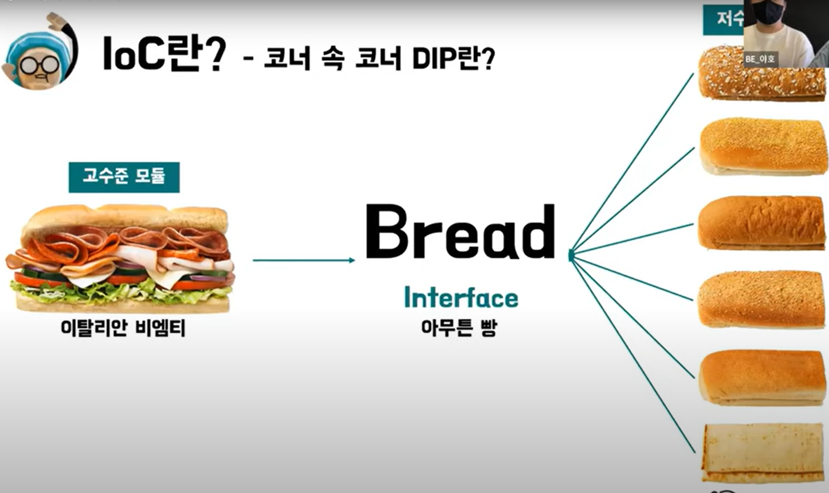 ItalianBMT는 화이트,파마산 오레가노 빵등 어떠한 빵 종류도 받을 수 있는 Bread라는 인터페이스를 인자로 받고 있다.