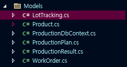 그리고 이 모델들은 ProductionDbContext 클래스에서 관리된다. 이 클래스는 DbContext를 상속받아 데이터베이스 연결 및 쿼리를 처리한다.