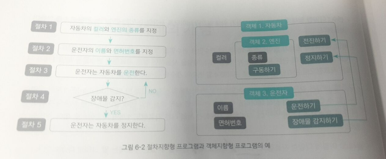 반면 객체지향형 프로그램은 이 프로그램에서 사용되는 객체(자동차,엔진,운전자)를 생성하고,각 객체에 포함된 데이터(컬러,엔진,이름,면허번호,종류)와 기능(구동하기,전진하기,운전하기,장애물 감지하기)을 상호 호출함으로써 프로그램을 구성하는 방식을 말한다.