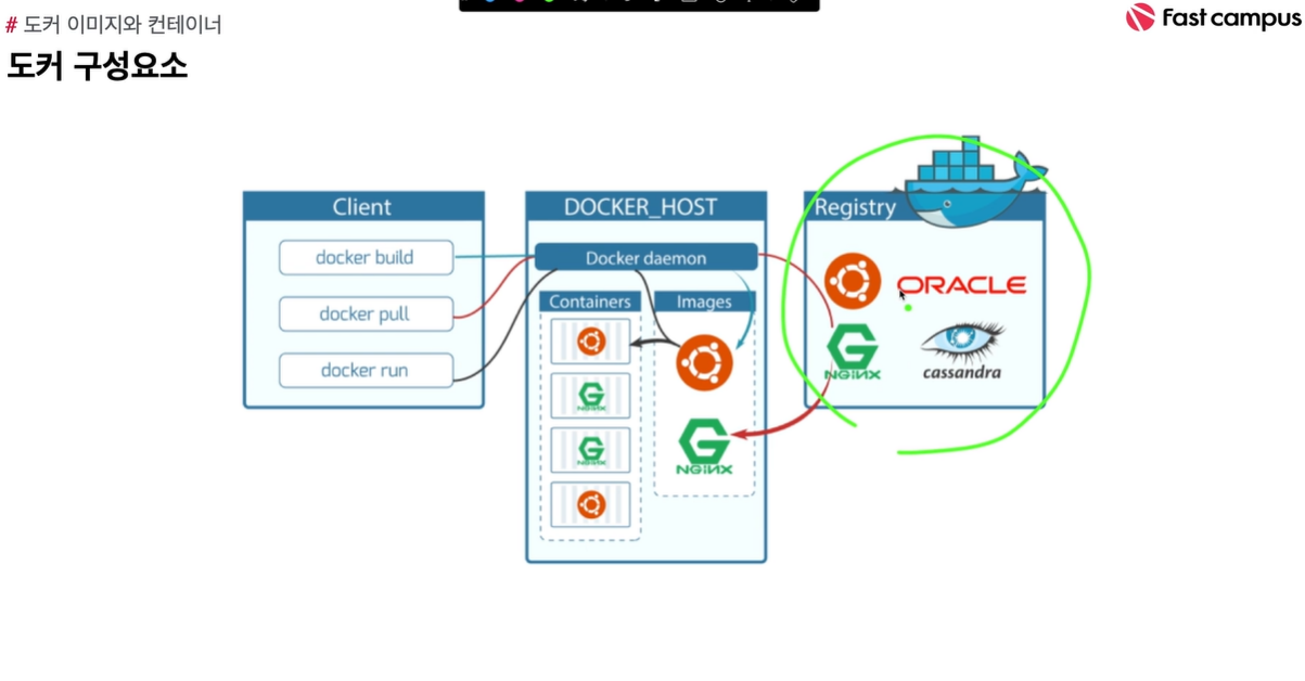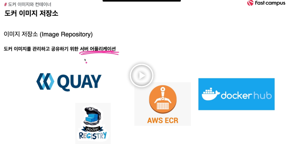 이미지를 가져올 때 쓰는 것을 registry(이미지 저장소) 라고 한다.